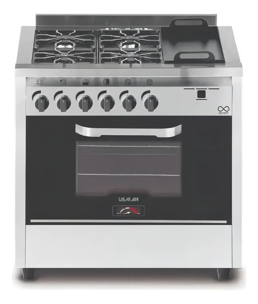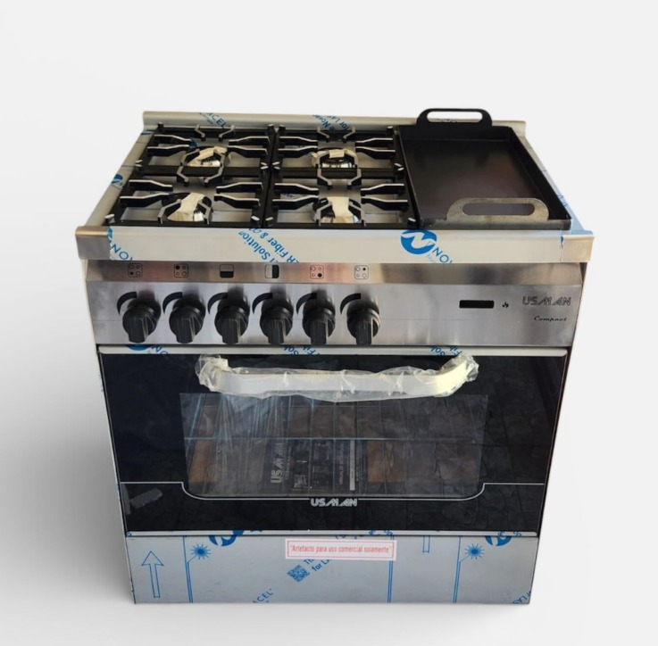 Marca Usman Modelo 4800 Voltaje 220V Tipo de gas GN Tipo de montaje De pie Otros Con tapa No Registros de producto Organismo de certificación (OCP) Otro (sin especificar) Especificaciones generales Tipo de alimentación Gas Tipo de encendido Manual Es industrial Sí Especificaciones de la cocina Con válvulas de seguridad Sí Especificaciones del horno Tipo de puerta del horno Con visor Con temporizador No Otros Con cajón parilla No Cocina Usman "Compact 4+Plancha" (4800)