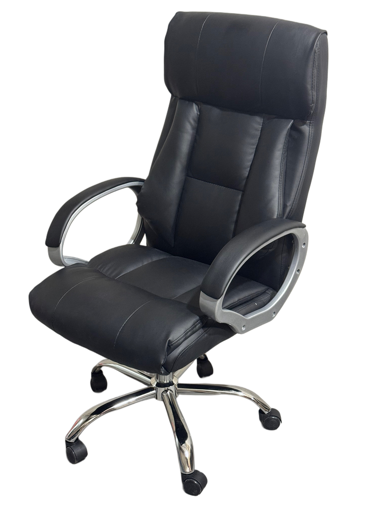 La Silla Ejecutivo Gerente combina comodidad, elegancia y resistencia para tu oficina o home office. ✔️ Respaldo alto y acolchonado con diseño ergonómico. ✔️ Tapizado en símil cuero negro, elegante y fácil de limpiar. ✔️ Apoyabrazos curvos con detalles metálicos. ✔️ Base cromada con ruedas de desplazamiento suave. ✔️ Regulación de altura para mayor confort.