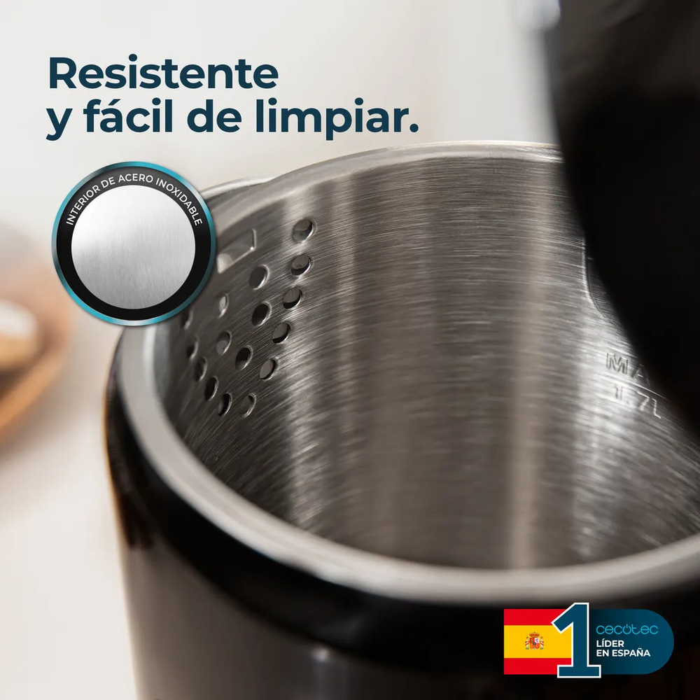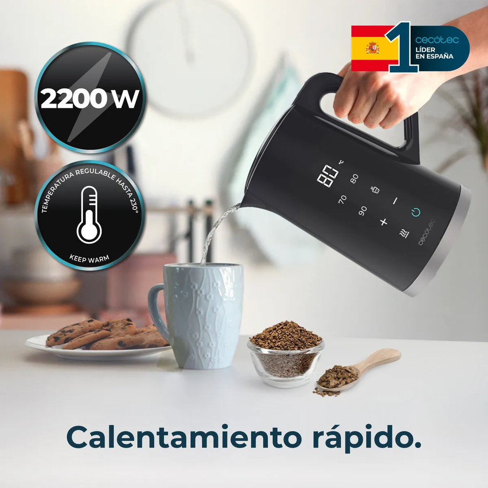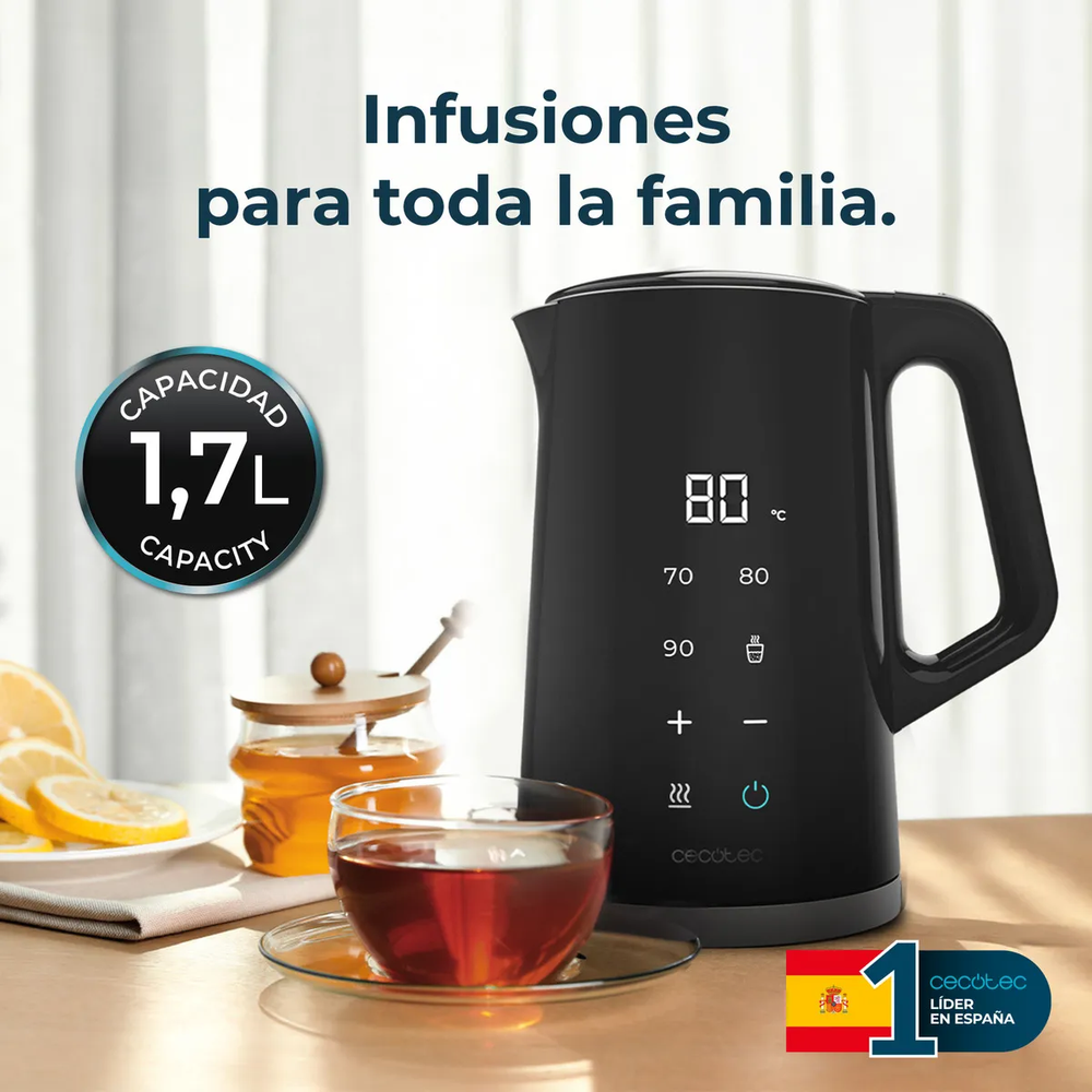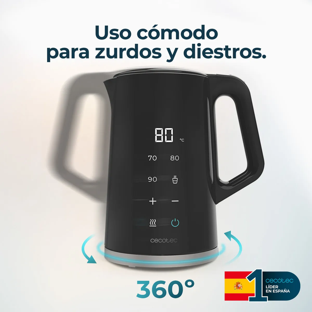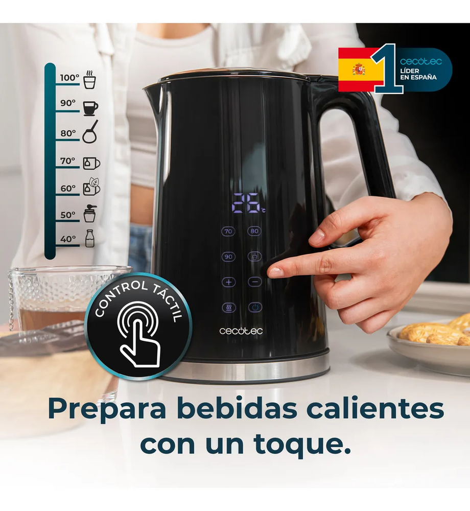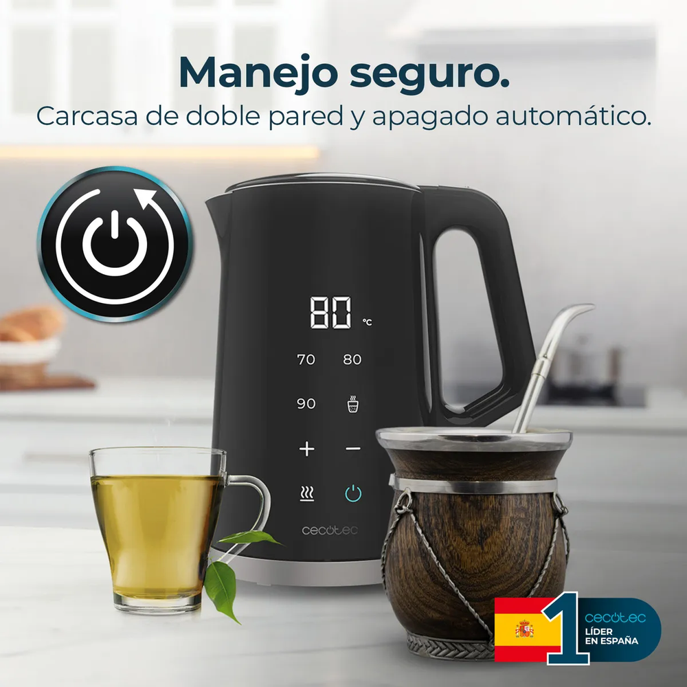 Marca Cecotec Línea THERMOSENSE Modelo ThermoSense 800 Color NEO Voltaje 220V Potencia 2.200 W Otros Con termómetro Sí Con corte automático Sí Con indicador de agua Sí Con luz indicadora de funcionamiento Sí Especificaciones Capacidad en volumen 1,7 L Con control de temperatura Sí Cantidad de niveles de temperatura 5 Con función mate Sí Características de la estructura Materiales Acero inoxidable Con filtro Sí Con pantalla digital Sí Con base giratoria Sí Infusiones para todos Aprovechá la gran capacidad de 1,7 litros del hervidor de agua Thermosense 800 Neo y prepará infusiones para todos tus invitados y familiares de una sola tanda Ideal para el mate Utilizá su panel táctil y elige entre sus 5 niveles de temperatura en función de lo que te apetezca en cada momento: 40 ºC para calentar leche, 70 ºC para té verde, 80 ºC para té o mate, 90 ºC para café o 100 ºC para hervir agua. Comodidad a tu alcance La base del hervidor es independiente y cuenta con apagado automático para facilitar el uso y evitar preocupaciones. Base 360° Su base con giro 360º permite el uso tanto a diestros como a zurdos y aporta una gran comodidad en cada uso, para que nada te aparte de disfrutar de tus deliciosas infusiones. Material de Acero inoxidable Lo que facilita la limpieza, alarga su vida útil y protege tu salud impidiendo la formación de partículas. Apagado automático La seguridad es lo primero. Su diseño con carcasa doble previene quemaduras durante su uso y su sistema de apagado automático reduce cualquier riesgo mientras no lo estés usando. 2200 W de potencia Minimizá el tiempo de espera en cada infusión gracias a su potencia de 2200 W. Además, su sistema Keep Warm mantendrá el calor de tus bebidas hasta 2 horas, para que siempre las disfrutes bien calientes.