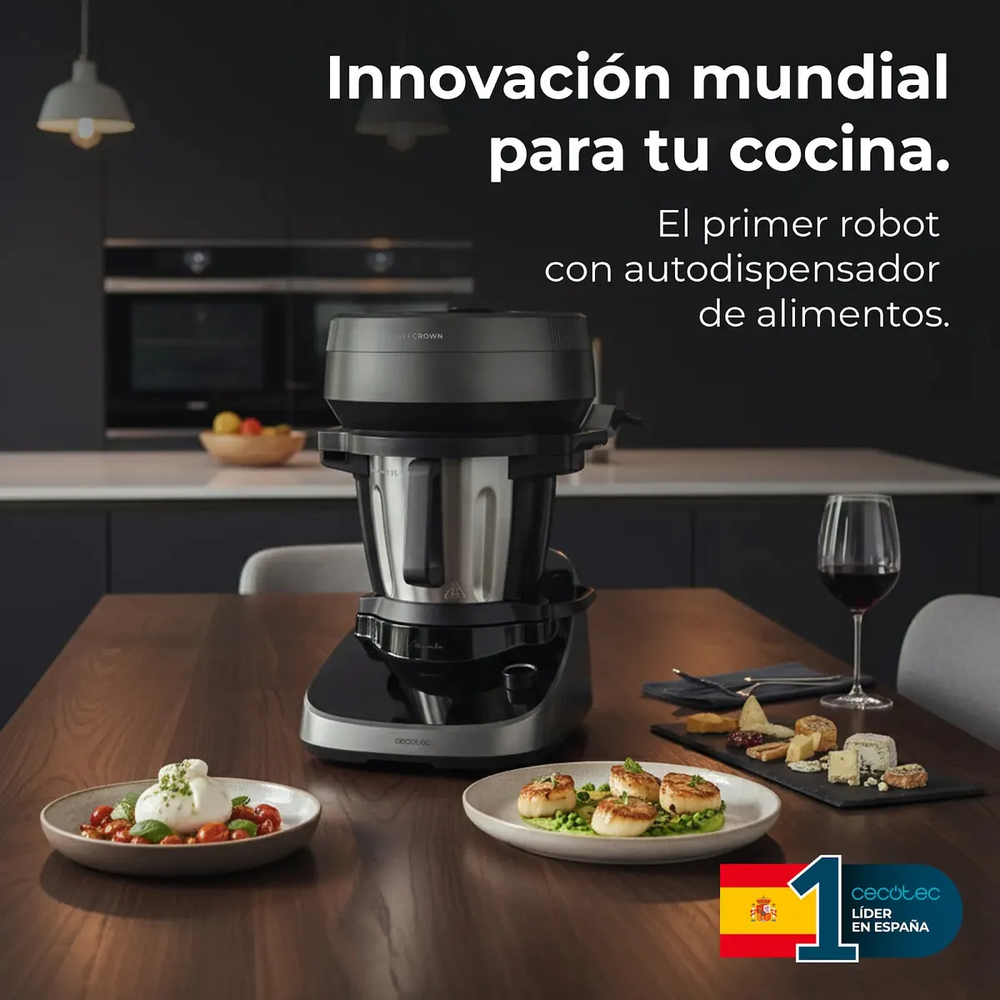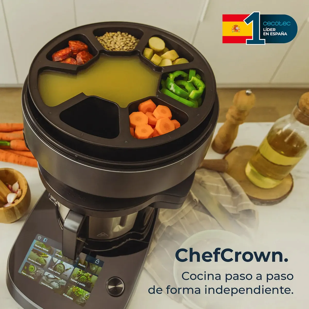 Dispensador automático de alimentos ChefCrown con 6 compartimentos: coloca los ingredientes en los compartimentos y el robot los va añadiendo en el momento exacto. Esto garantiza texturas más homogéneas y sabores equilibrados.