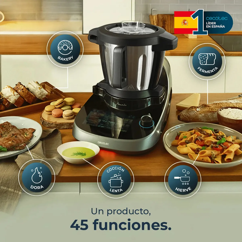 45 funciones integradas en un solo robot: trocea, tritura, sofríe, amasa, cocina al vapor, fermenta, confita, monta, emulsiona, mezcla, hierve y más. Reemplaza múltiples electrodomésticos, libera espacio en tu cocina y amplía tus posibilidades culinarias.