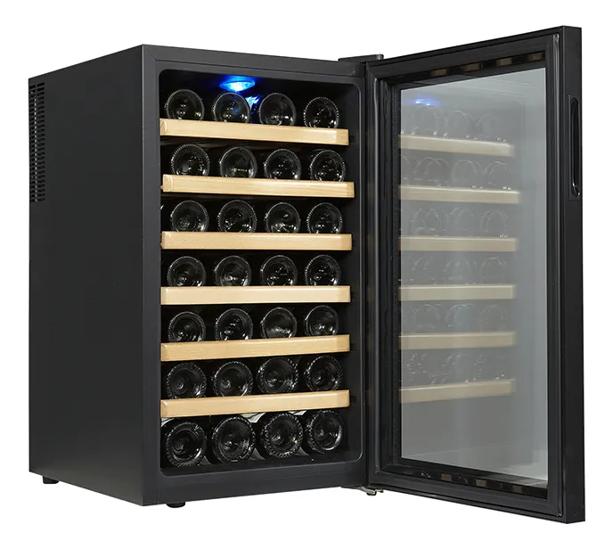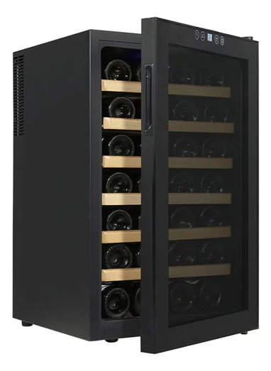 Marca Vondom Modelo T28 Color Negro Voltaje 220V Modelo detallado T28 Frecuencia 50 Hz Potencia 70 W Temperatura Cantidad de zonas de temperatura 1 Temperatura mínima - Temperatura máxima 10 °C - 18 °C Con control de temperatura Sí Especificaciones Capacidad de botellas 28 Sistema de refrigeración Termoeléctrico Capacidad en volumen 70 L Cantidad de bandejas 5 Material de la bandeja Madera Orientación de la cava Vertical Materiales de la puerta Vidrio doble templado Peso y dimensiones Ancho x Profundidad x Altura 43 cm x 51 cm x 73 cm Peso 20 kg Otros Con luz interior Sí Con sistema antivibración Sí Cava de vinos para 28 botellas con estantes de madera