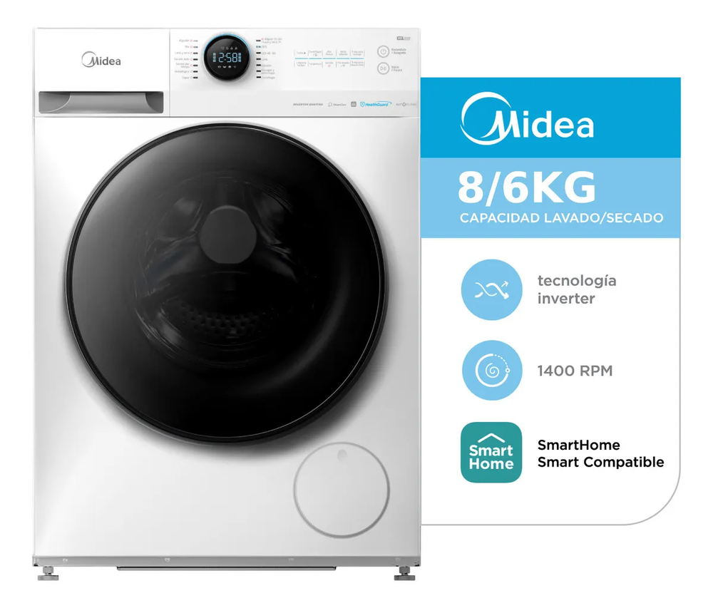 Marca Midea Línea Lavasecarropas Midea Inverter Modelo MF200D80WB/T-A1 Modelo alfanumérico MF200D80WB/T-A1 Voltaje 220V Color Gris oscuro Modelo detallado MF200D80WB/T-A1 Lavado Tipos de carga de agua Automática Con lavado rápido Sí Cantidad de programas de lavado 15 Sistema de lavado Europeo Tecnología Con tecnología inverter Sí Con función para control de smartphone Sí Con conexión Wi-Fi No Con comienzo diferido Sí Tecnologías integradas Agregar prenda, Aire Fresco, Allergy Care, Función Fresh, Inverter Quattro, Steam Care, Turbo Wash Con alarma de finalización Sí Otros Es industrial No Programas de lavado 20°C, Algodón, Antialérgico, Centrifugar, Eco 40° - 60° C, Edredón, Enjuagar y centrifugar, Lana, Lava y seca, Lava y seca 1hr, Mix, Rápido 15 Min, Secado auto, Secado por tiempo, Vapor Con impacto positivo Sí Especificaciones Tipo de lavarropas Automático Tipo de carga Frontal Capacidad del lavarropas 8 kg Eficiencia energética A Es lavasecarropas Sí Tipo de secado Condensación Capacidad de secado 6 kg Con bomba de desagote Sí Centrifugado Con centrifugado Sí Velocidad de centrifugado 1.400 rpm Con regulación de velocidad de centrifugado Sí Dimensiones Altura 85 cm Ancho 59,5 cm Peso 65 kg Peso y dimensiones Profundidad 47,5 cm Temperatura Con regulador de temperatura Sí Características de la estructura Con filtro Sí Con pantalla Sí Con bloqueo de panel Sí Con bloqueo de seguridad de puerta Sí Tipos de control Botones, Perillas Cantidad de tambores 1 Es portátil No Material del tambor Acero inoxidable LAVASECARROPAS MIDEA INVERTER SMART 8 Kg MF200D80WB/T-A1