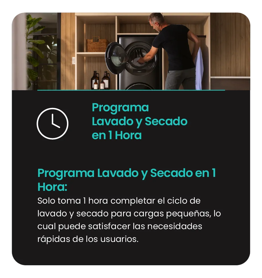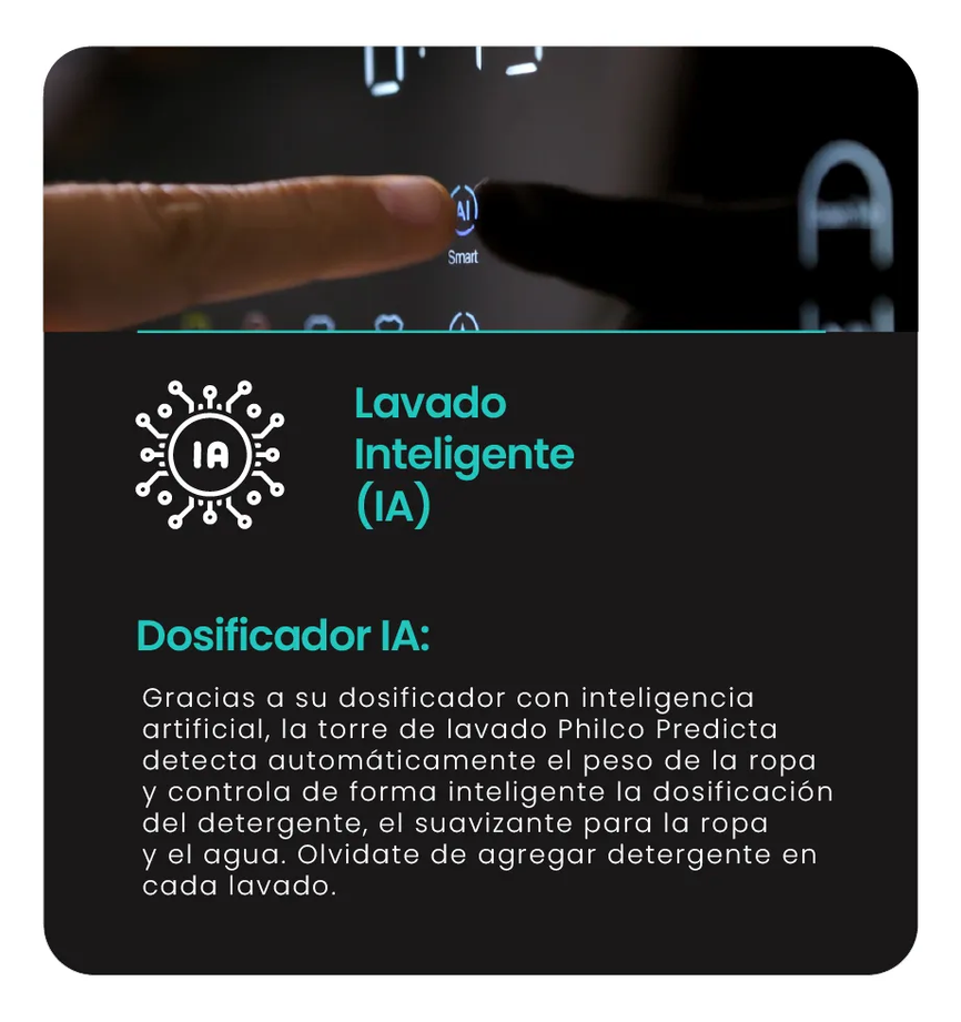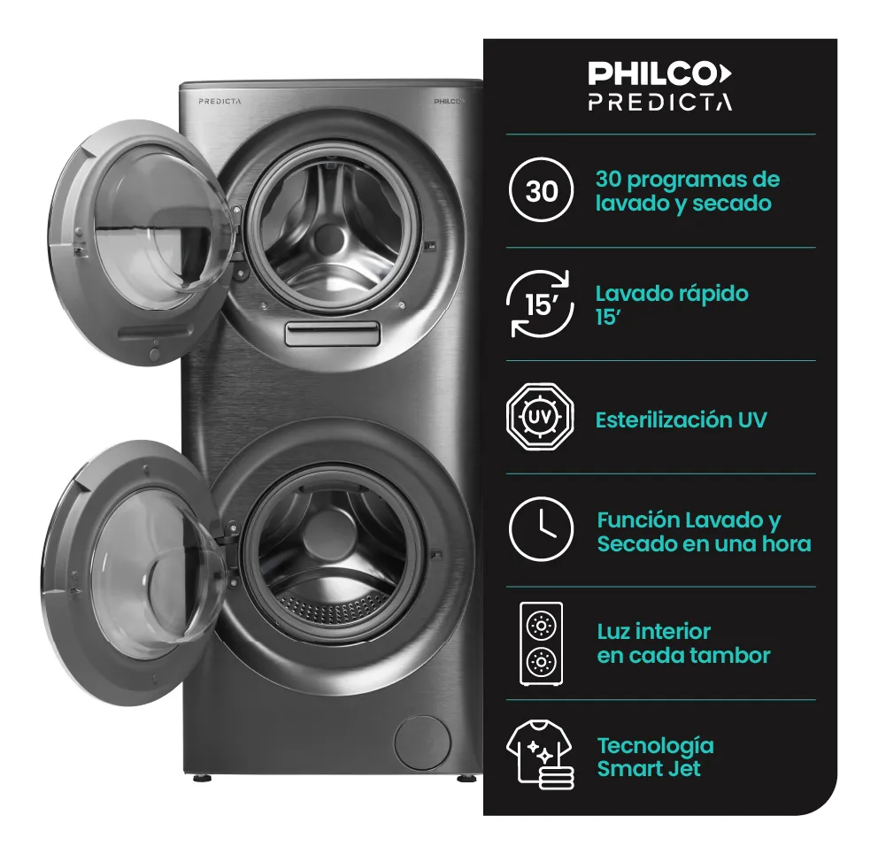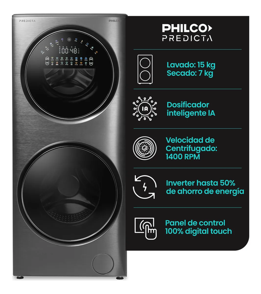 Características principales Tipo de alimentación 220V Especificaciones Tipo de lavarropas Automático Tipo de carga Frontal Capacidad del lavarropas 15 kg Eficiencia energética A++ Es lavasecarropas Sí Tipo de secado Condensación Capacidad de secado 7 kg Con bomba de desagote Sí Centrifugado Con centrifugado Sí Velocidad de centrifugado 1.400 rpm Con regulación de velocidad de centrifugado Sí Con centrifugado autoequilibrado Sí Dimensiones Altura 1,4 m Ancho 60 cm Peso 133 kg Peso y dimensiones Profundidad 60,5 cm Temperatura Con regulador de temperatura Sí Temperatura del agua 50°C, 80°C, 70°C, Fría, 60°C, 30°C, 40°C Otros Es industrial No Características generales Marca Philco Línea Torre Modelo PHLFT157 Modelo alfanumérico PHLFT157 Voltaje 220V Color Gris oscuro Lavado Tipos de carga de agua Automática Con lavado rápido Sí Con función antiarrugas Sí Con carga autoadaptativa Sí Cantidad de programas de lavado 30 Sistema de lavado Europeo Tecnología Con tecnología inverter Sí Con función para control de smartphone No Con conexión Wi-Fi No Con comienzo diferido Sí Tecnologías integradas Dosificador Inteligente IA, Smart Jet Con alarma de finalización Sí Características de la estructura Con filtro Sí Con pantalla Sí Tipo de pantalla LED Con bloqueo de panel Sí Con bloqueo de seguridad de puerta Sí Tipos de control Pantalla táctil Cantidad de tambores 2 Es portátil No Material del tambor Acero inoxidable