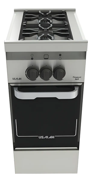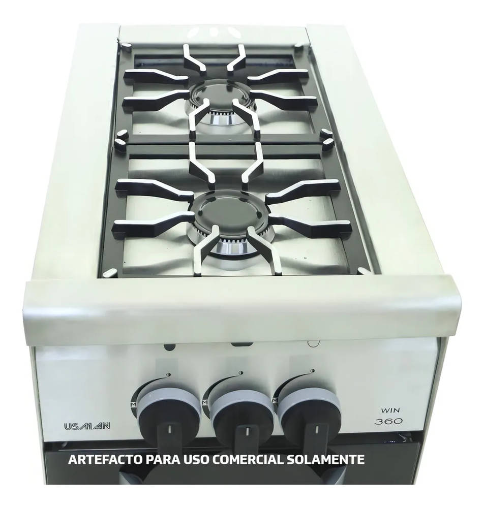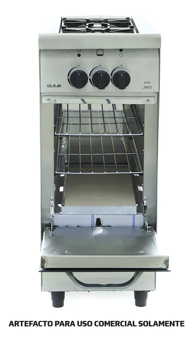 Características generales Marca Usman Modelo Compact 360 Color Acero inox Tipo de gas Multigas Es convertible a GN Sí Es convertible a GLP Sí Tipo de montaje De pie Especificaciones del horno Tipo de puerta del horno Con visor Con horno doble No Con temporizador No Con horno autolimpiante No Con grill en el horno No Con luz en el horno No Otros Con tapa No Con patas Sí Especificaciones generales Tipo de alimentación Gas Tipo de encendido Manual Es industrial Sí Especificaciones de la cocina Cantidad de hornallas 2 Con válvulas de seguridad No Con plancha No Con freidora No Con pantalla digital No Con comando táctil No Con tostador No Con baño María No Peso y dimensiones Altura x Ancho x Profundidad 87 cm x 36 cm x 62 cm Peso 40 kg Otros Con cajón parilla No Cocina Industrial en Acero Inoxidable.