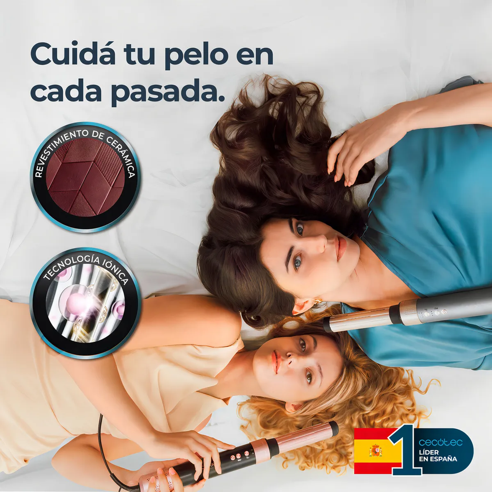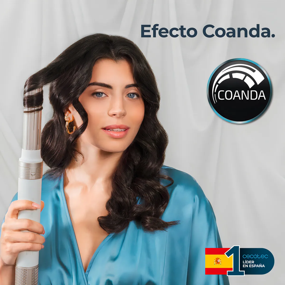 Tecnología Coanda: el aire del moldeador tiende a seguir la superficie de los dos cilindros rizadores, enrollando el cabello alrededor del moldeador y creando rizos perfectos sin esfuerzo.