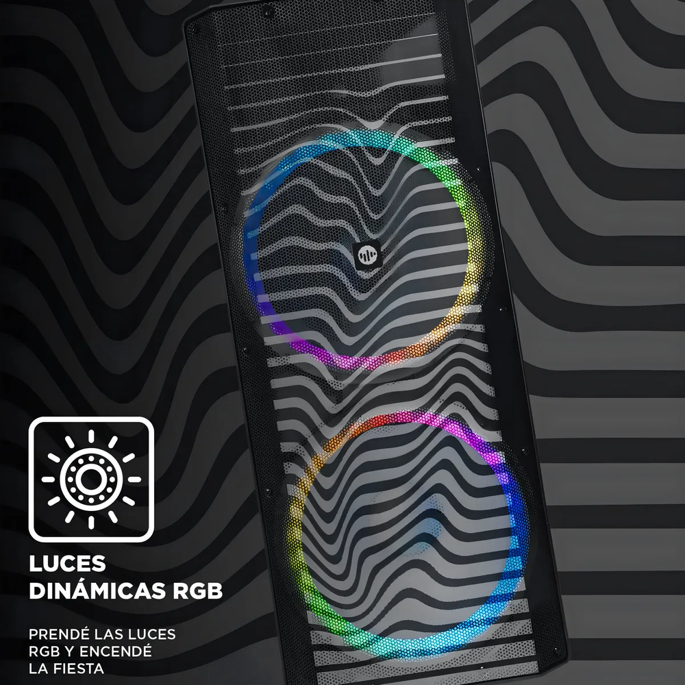 El Stromberg Inspire-Pro es sinónimo de potencia y portabilidad: 300W RMS para sonido nítido, woofer de 2x15'' para bajos profundos, y luces RGB para ambientar tu evento. Además, incluye micrófono, con conectividad Inalámbrica y entradas XRL para una experiencia profesional completa.