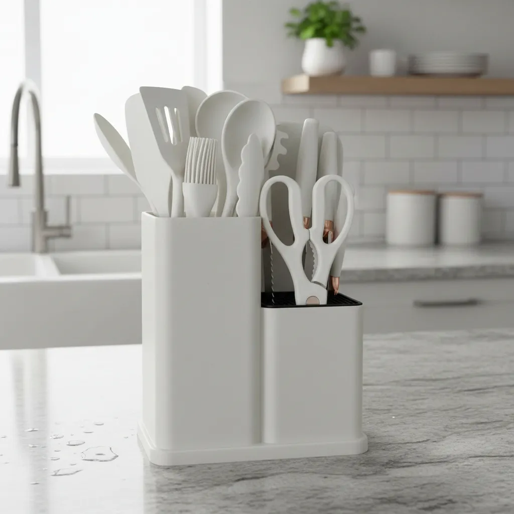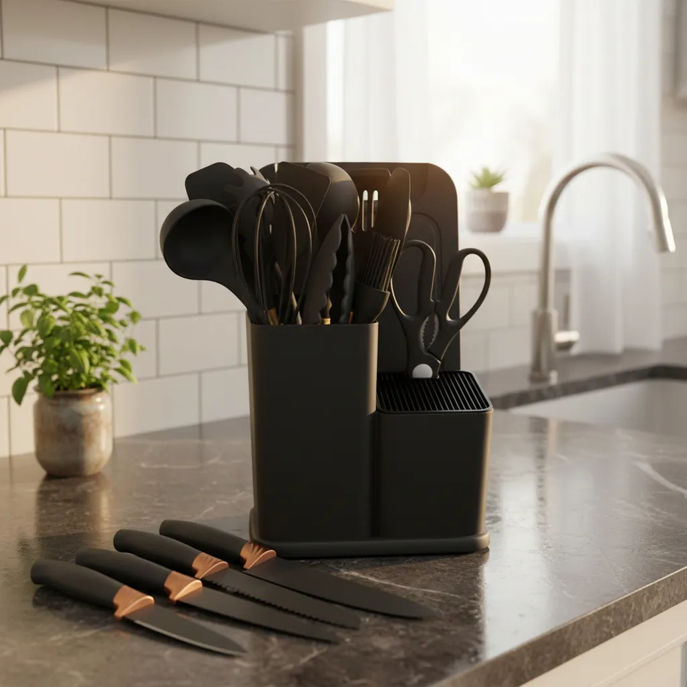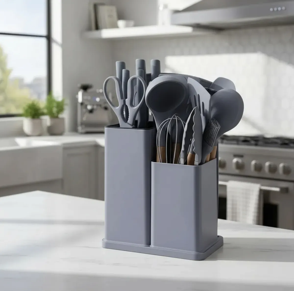 Olvidate de los utensilios desparejados y los cajones desordenados. Este set de cocina Todo en Uno te brinda todo lo necesario para picar, batir, servir y cocinar de manera práctica y eficiente, cuidando tus ollas y sartenes. Fabricado con silicona de grado alimenticio, es ideal para superficies antiadherentes como teflón o cerámica, ya que no raya ni daña. Además, incluye un set de cuchillos de acero inoxidable con filo preciso y diseño ergonómico que facilita cada corte. El conjunto incorpora una base organizadora, que mantiene todos los utensilios ordenados y al alcance, aportando funcionalidad y estilo a tu cocina. Disponible en varios colores para adaptarse a tu espacio. Características destacadas: Utensilios de silicona anti-rayaduras Cuchillos de acero inoxidable de alta durabilidad Diseño práctico y funcional Ideal para uso doméstico y gastronómico Contenido del set (19 piezas): Utensilios de silicona y madera (11): Espátula ranurada Espátula sólida Cuchara profunda Cuchara ranurada Espátula flexible para repostería Servidor de pasta Cucharón de sopa Brocha de cocina Batidor de globo Pinzas con seguro Espátula plana Set de corte profesional (6): Cuchillo de chef Cuchillo de pan Cuchillo rebanador Cuchillo utilitario Cuchillo pelador Tijera de cocina multiuso Organización (2): Tabla de picar Base organizadora para utensilios y cuchillos Un set completo que combina orden, protección y eficiencia, ideal para equipar tu cocina con todo lo necesario en un solo producto. Sin garantía