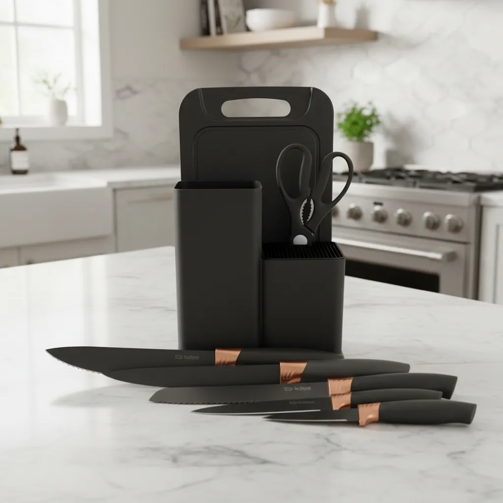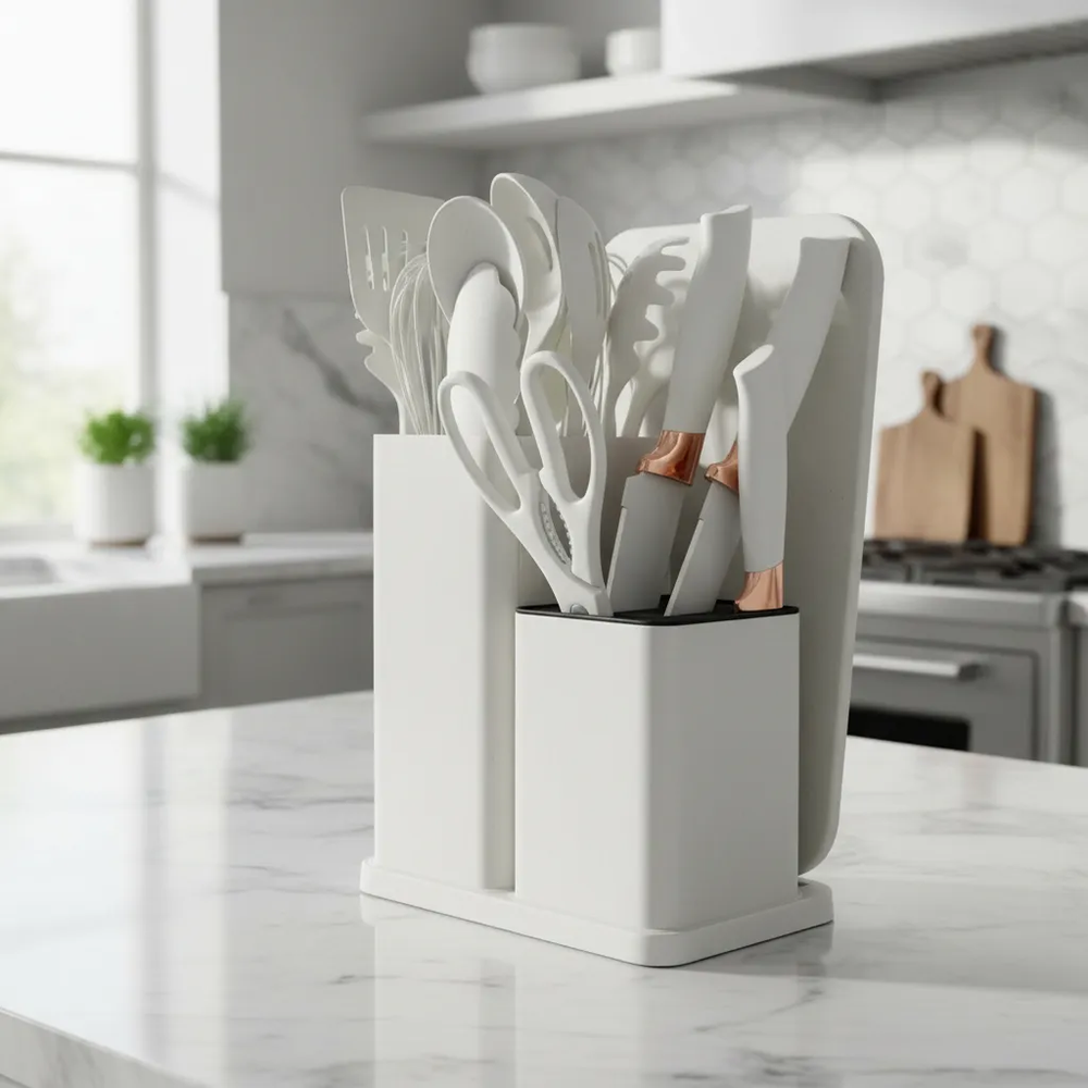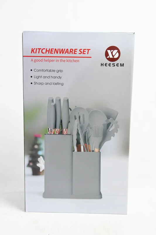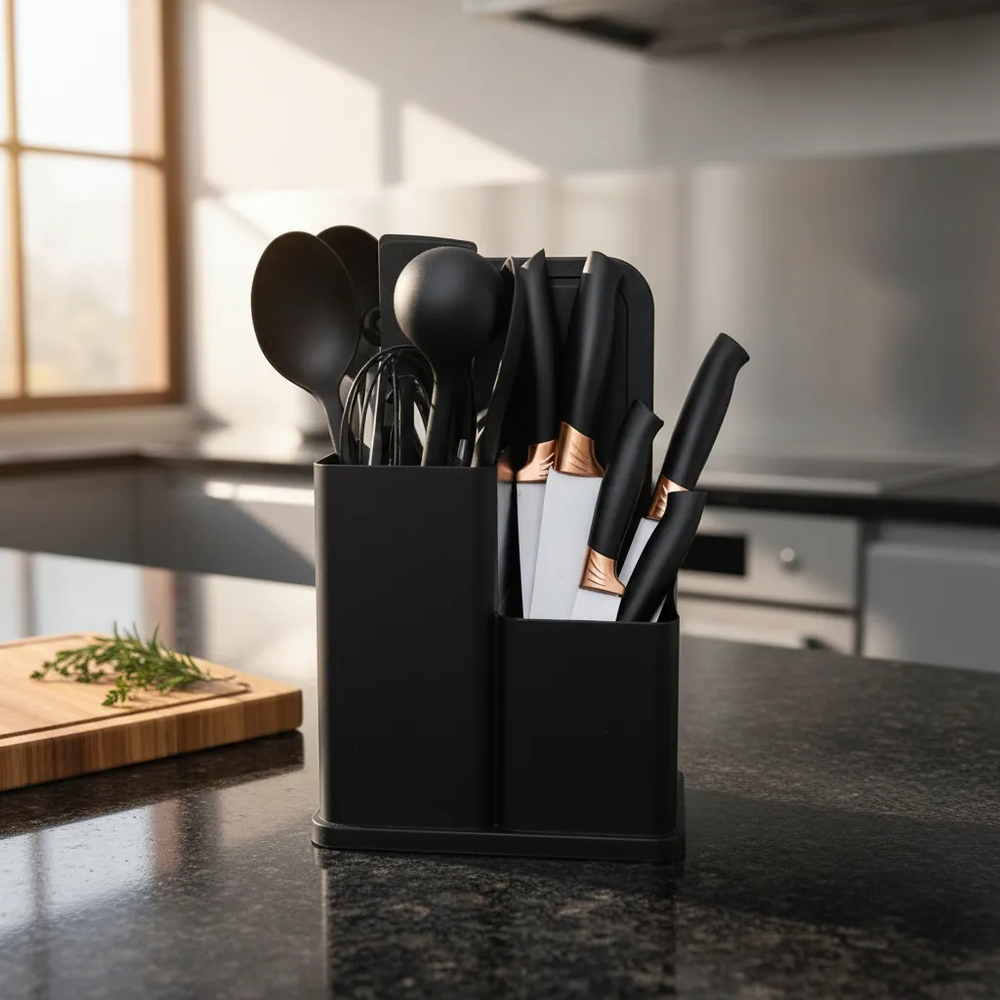 Olvidate de los utensilios desparejados y los cajones desordenados. Este set de cocina Todo en Uno te brinda todo lo necesario para picar, batir, servir y cocinar de manera práctica y eficiente, cuidando tus ollas y sartenes. Fabricado con silicona de grado alimenticio, es ideal para superficies antiadherentes como teflón o cerámica, ya que no raya ni daña. Además, incluye un set de cuchillos de acero inoxidable con filo preciso y diseño ergonómico que facilita cada corte. El conjunto incorpora una base organizadora, que mantiene todos los utensilios ordenados y al alcance, aportando funcionalidad y estilo a tu cocina. Disponible en varios colores para adaptarse a tu espacio. Características destacadas: Utensilios de silicona anti-rayaduras Cuchillos de acero inoxidable de alta durabilidad Diseño práctico y funcional Ideal para uso doméstico y gastronómico Contenido del set (19 piezas): Utensilios de silicona y madera (11): Espátula ranurada Espátula sólida Cuchara profunda Cuchara ranurada Espátula flexible para repostería Servidor de pasta Cucharón de sopa Brocha de cocina Batidor de globo Pinzas con seguro Espátula plana Set de corte profesional (6): Cuchillo de chef Cuchillo de pan Cuchillo rebanador Cuchillo utilitario Cuchillo pelador Tijera de cocina multiuso Organización (2): Tabla de picar Base organizadora para utensilios y cuchillos Un set completo que combina orden, protección y eficiencia, ideal para equipar tu cocina con todo lo necesario en un solo producto. Sin garantía