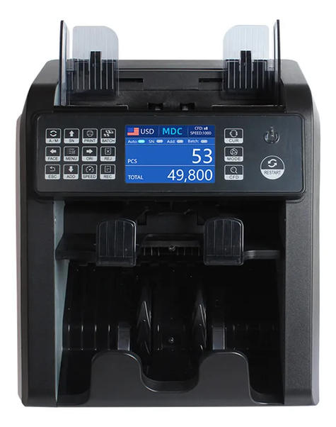 Clasificadora de billetes con lectura, conteo y detección de denominaciones UV/MG/IR/SDC/MDC. Detección automática de moneda (ARS-USD-EUR). Velocidad: 1200 billetes/min. Capacidad de carga: 500 billetes. PANTALLA TÁCTIL (TFT 4.5 pulgadas). DOBLE BANDEJA DE DESCARGA. Especificaciones > Lectura, conteo y detección en simultáneo de distintas denominaciones > Identificación automática de moneda > Detección imagen, IR, MG, UV > Detección de pesos, dólares y euros falsos sin interrupción de conteo > Tecnología 2 CIS > Lectura de números de serie de los billetes > Panel de control táctil y pantalla TFT de gran tamaño (4.5 pulgadas) > Funciones: Batch, Add y Auto-detección de moneda > Carga superior > Capacidad de bandeja de carga superior: 400 - 500 billetes > Capacidad de bandeja de descarga: 200 billetes > Velocidad de conteo: hasta 1200 billetes/min para modo CNT (sólo conteo); hasta 1000 billetes/min para modos SDC y MDC (detección de denominaciones) > Detección de billetes pegados y rotos > Monedas disponibles: ARS, USD, EUR y más > Software actualizable para nuevos billetes > Interfaces: USB, RS-232, RJ-11 > Fuente de alimentación: 220V; 50/60 Hz; 80W > Dimensiones del producto: 245 x 270 x 288 mm > Dimensiones de la caja: 420 x 360 x 395 mm > Peso neto: 9.4 kg > Peso bruto: 11.2 kg