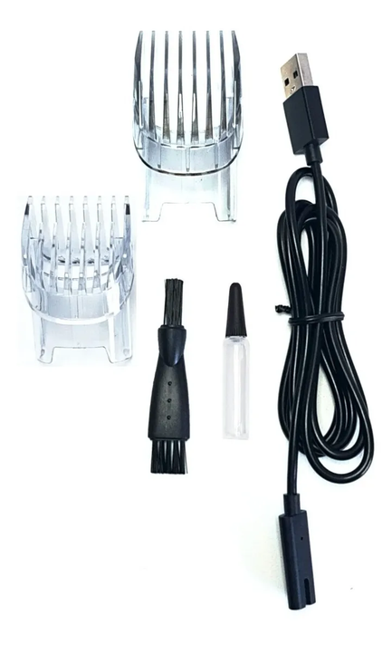 | 1 cable USB, 1 cepillo limpiador, 1 liquido lubricante, 1 peine 10mm, 1 peine 20mm |