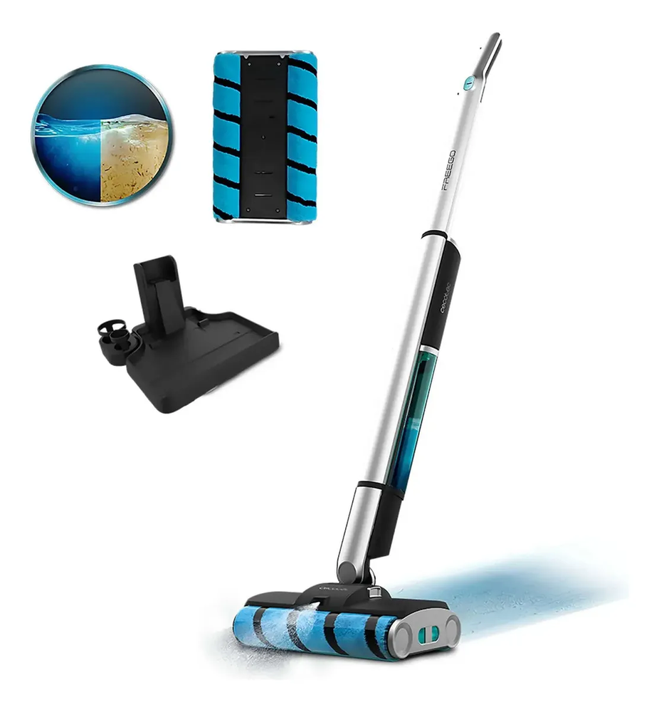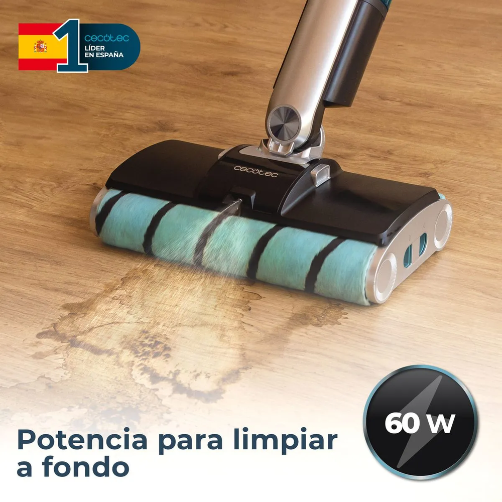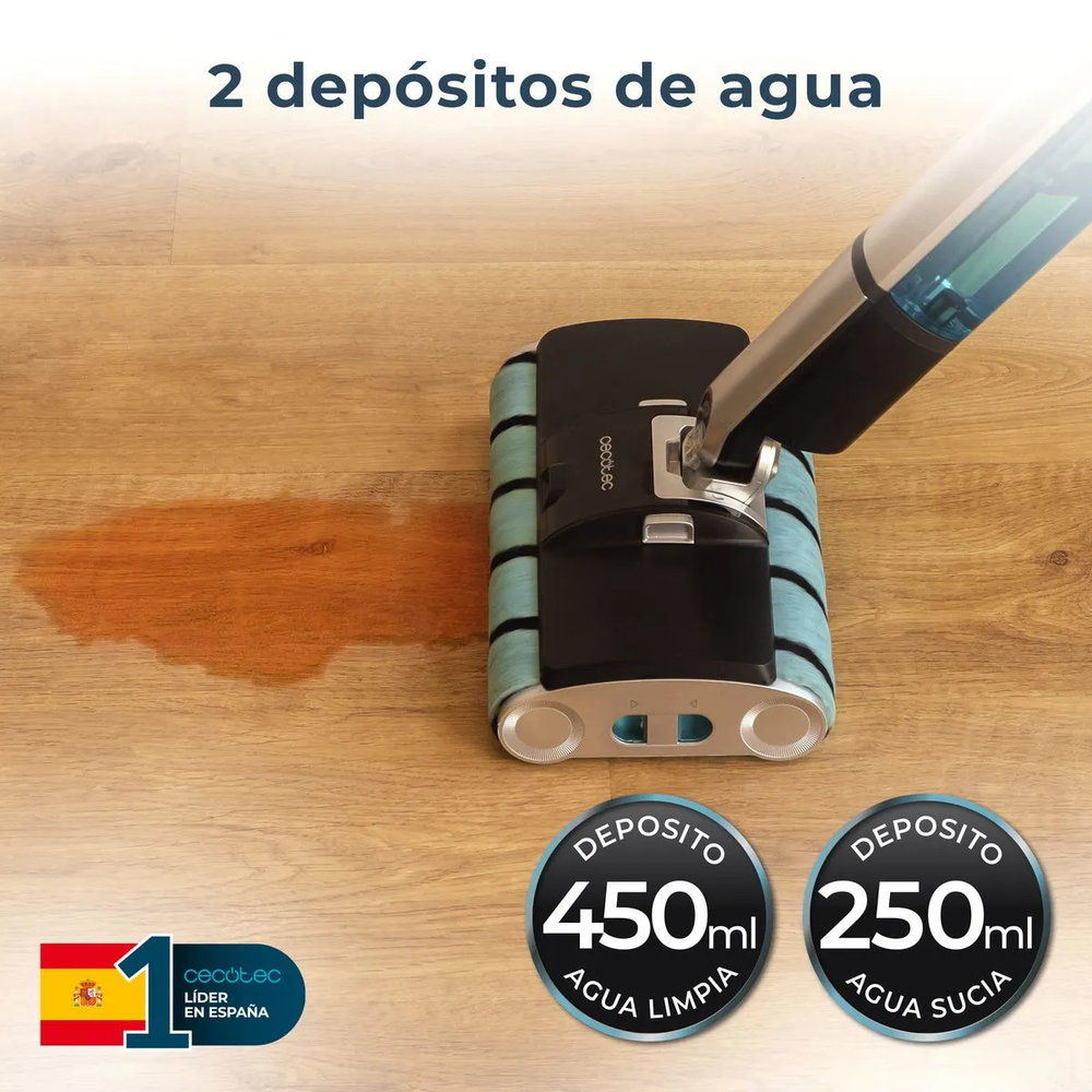 Mopa eléctrica FreeGo Wash Twice Spray de Cecotec. 40 min de autonomía para cubrir todas las superficies. Tecnología Wet Jalisco de doble rodillo súper absorbente desincrusta suciedad y absorbe líquidos. Tanques de agua limpia (400 ml) y agua sucia (350 ml) independientes para garantizar un fregado higiénico y con agua renovada. Spray delantero que pulveriza agua directamente sobre la suciedad. Base de autolimpieza para un mantenimiento rápido y sin esfuerzo.
