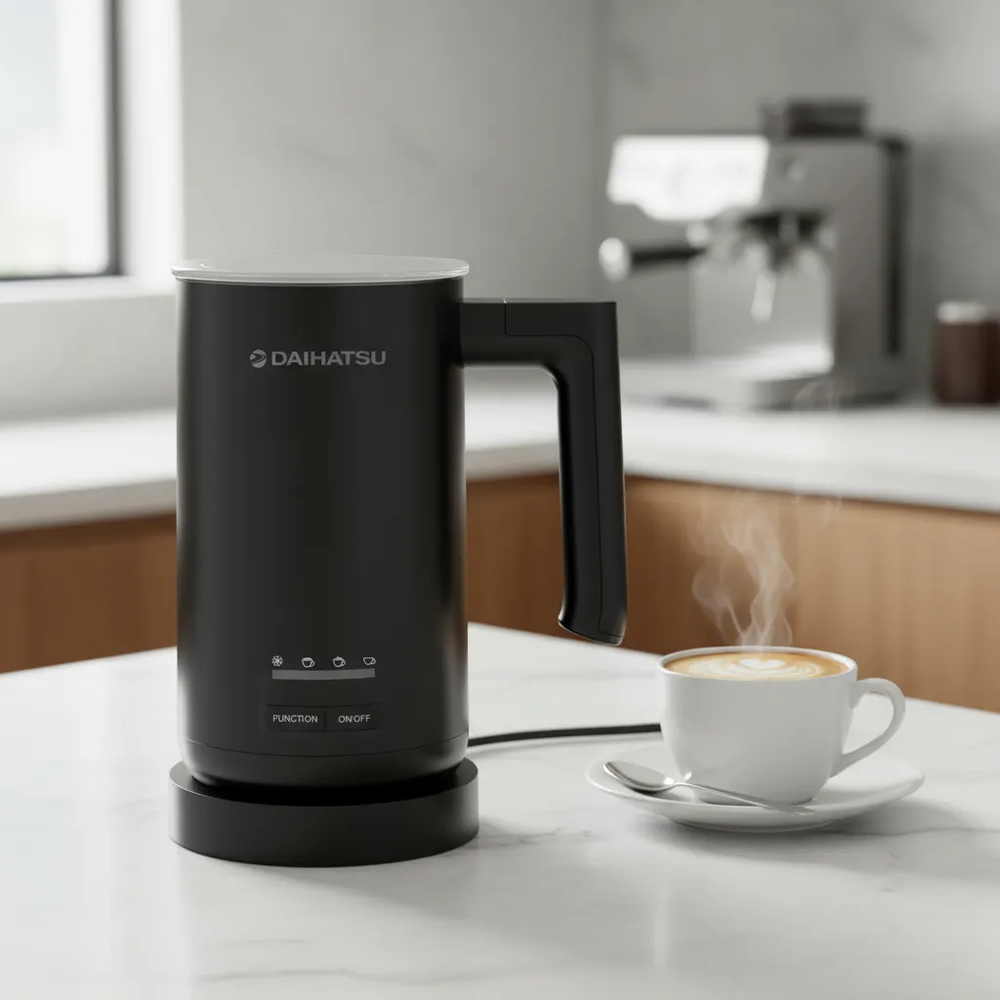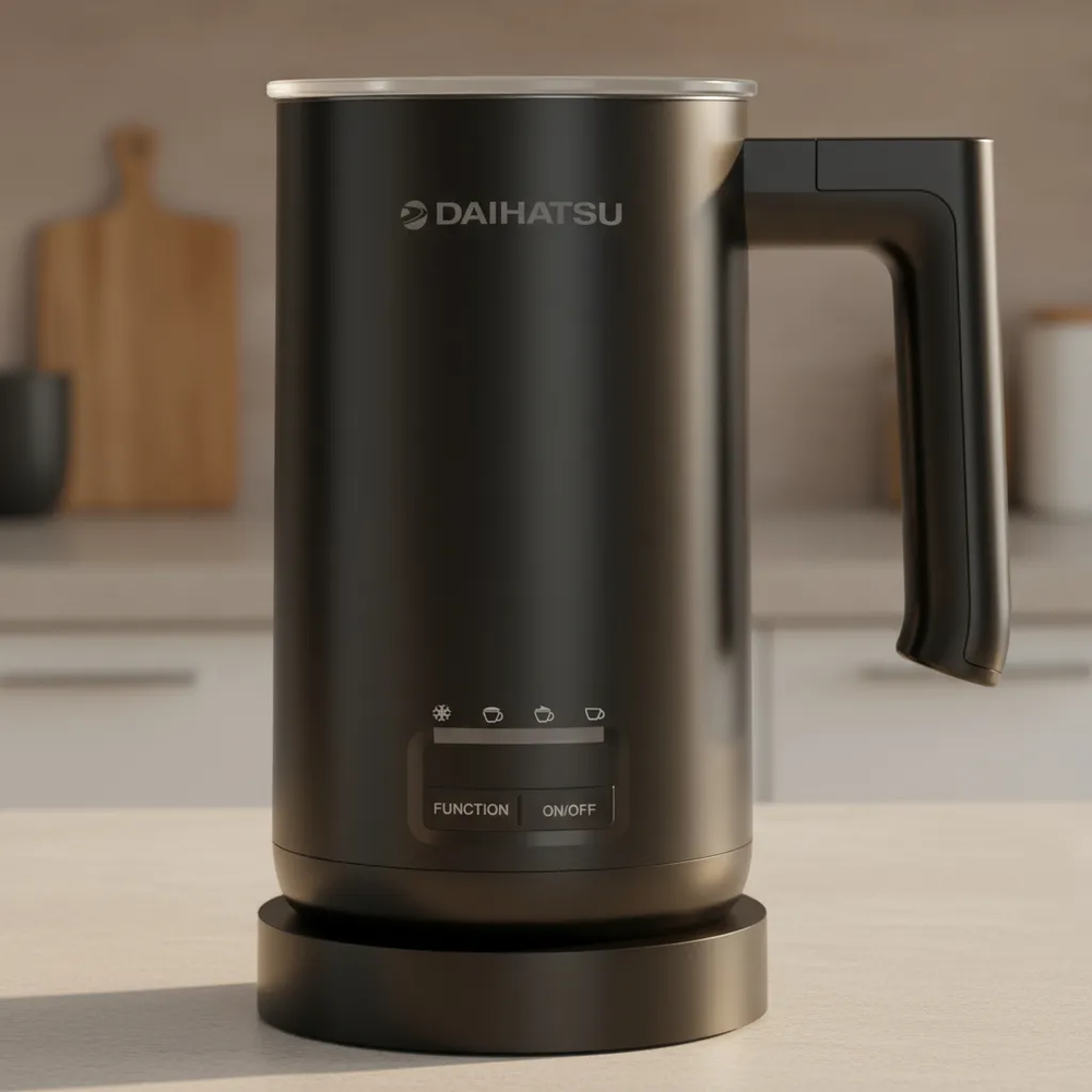 **ESPUMADOR DAIHATSU:** 4 Funciones: . Solo espumar, sin calentar . Espuma tibia y espesa . Espuma tibia y fina . Calentar sin espumar El Espumador Calentador Batidor de Leche DAIHATSU D-ES300/B es la herramienta ideal para los amantes del café y la leche espumada. Con una potencia de 500 W, este dispositivo permite calentar y espumar hasta 300 ml de leche en 90 segundos, garantizando una textura cremosa y suave en cada uso. Su diseño de mano facilita su manejo, permitiendo preparar deliciosas bebidas en cuestión de minutos. Este espumador cuenta con cuatro funciones que se adaptan a tus necesidades, ya sea para calentar leche, espumar o ambas. El apagado automático brinda seguridad en cada uso. Fabricado en aluminio, su construcción asegura durabilidad y un fácil mantenimiento. Con dimensiones compactas de 18 cm de largo, 10 cm de ancho y 10 cm de profundidad, es perfecto para cualquier cocina, sin ocupar demasiado espacio. La alimentación de 220-240V asegura un rendimiento óptimo, mientras que su diseño inalámbrico permite mayor libertad de movimiento durante su uso. Ideal para preparar lattes, cappuccinos o simplemente disfrutar de una leche caliente, este espumador es un complemento esencial para cualquier amante del café.