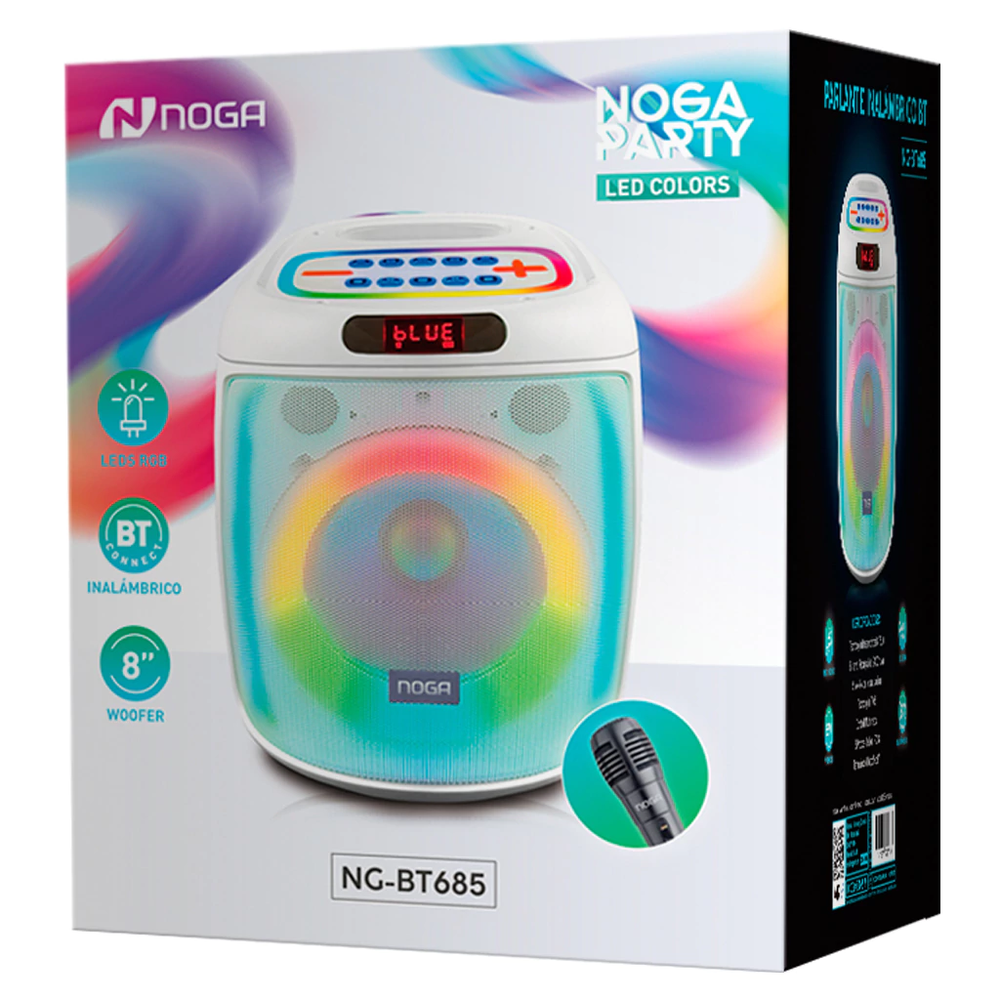 El NG-BT685 NOGA PARTY te brinda música y diversión con todos los beneficios de un Parlante Portable Inalámbrico. Su Tecnología BT permite sincronizalo con tu Smartphone, Tablet u otros dispositivos. Y su Tecnología TWS te permite vincularlo con otro Parlante del mismo modelo. Presenta unos LEDS RGB Dinámicos con 6 efectos lumínicos. Incluye Control Remoto y función Karaoke. Además posee manija para transportarlo. Armá una fiesta estés donde estés.